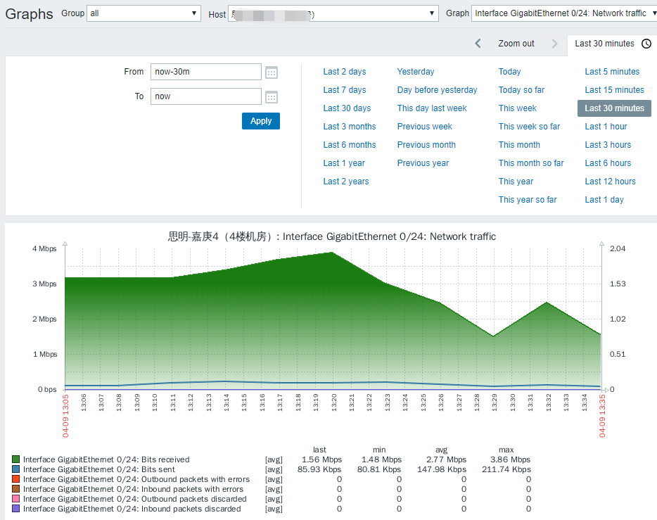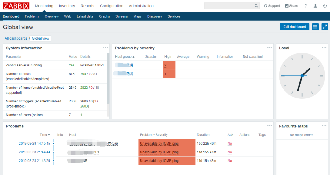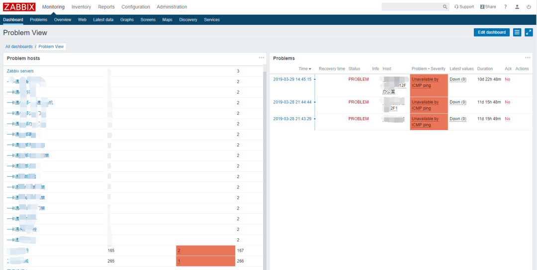 Zabbix主界面,最下面是目前问题的服务器或交换机。