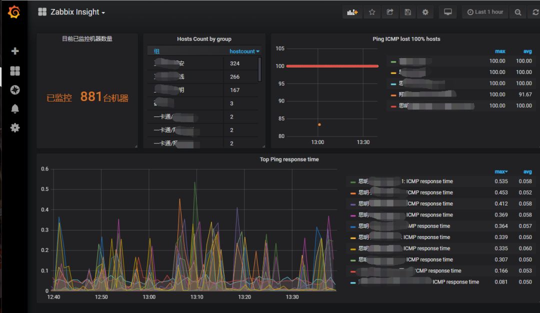 Grafana可以方便叠加Zabbix的指标。找出Ping时延最大的多台交换机。
