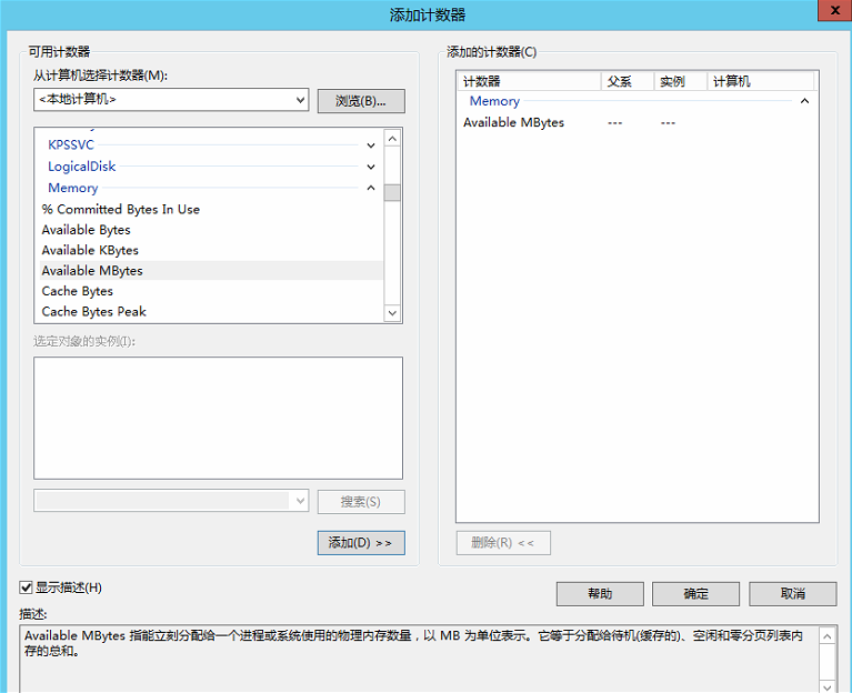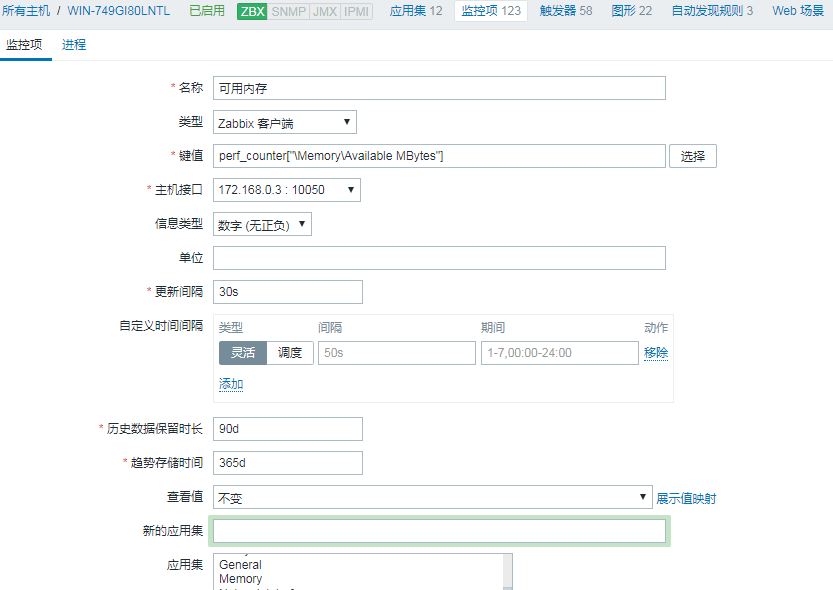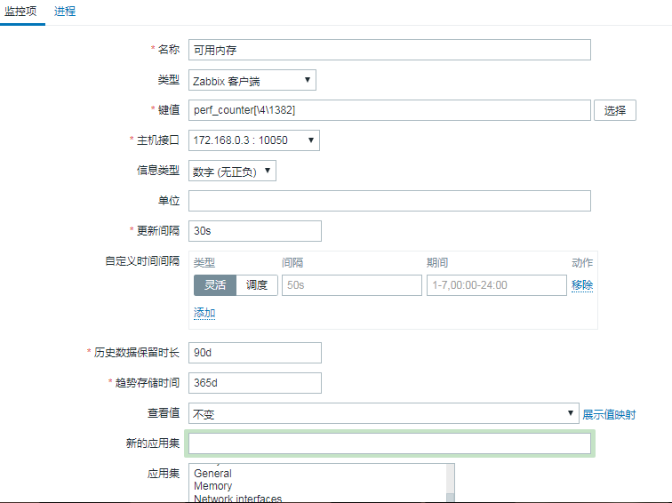 Zabbix agent提供了perf_counter[counter,<interval>]键值对性能监视器采集到的值进行监控,这里以监控可用内存为例,首先要添加一个计数器