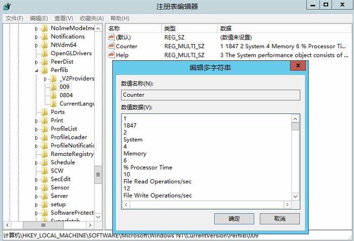 当然,这些计数器的路径也可以用数字来表示,路径与数字的映射值存在于注册表中,需要运行 regedit ,然后找到HKEY_LOCAL_MACHINE\SOFTWARE\Microsoft\Windows NT\CurrentVersion\Perflib\009这个注册表。