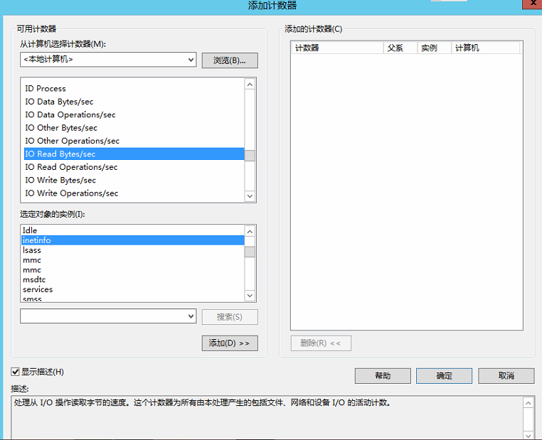 如果我们要监控IIS进程的详细信息,可以在process路径下添加计数器,inetinfo为IIS运行的软件名称