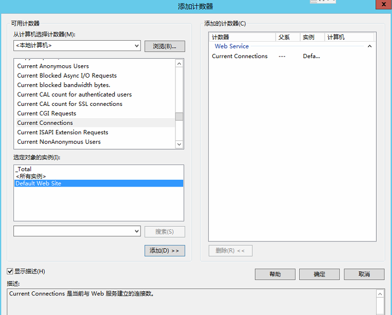 同样是使用性能监视器,添加一个IIS连接数的计数器来对其进行监控,存在于Web Service路径下,如果要对IIS的其他信息(比如处理的CGI请求数)进行监控,也是在Web Service路径下添加计数器
