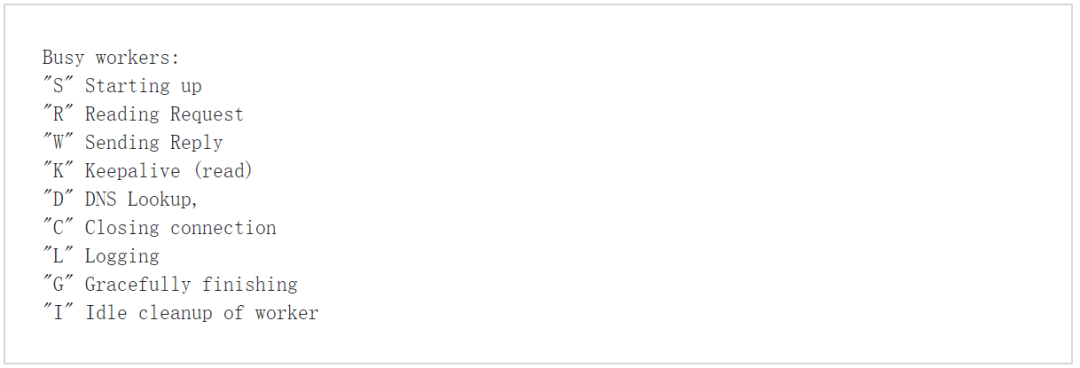 一般情况下,大多数workers应处于R/W或空闲状态(“_”)。如果看到大量workers处于比如“K”、“D”或“L”状态,那么在活动设置、DNS解析或日志记录方面可能出现了相应的问题。