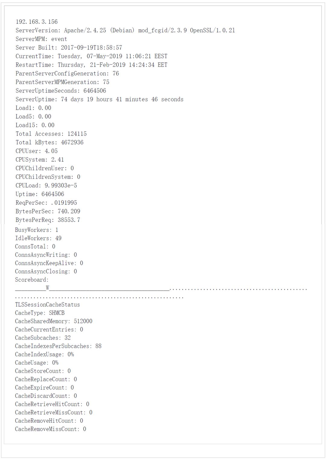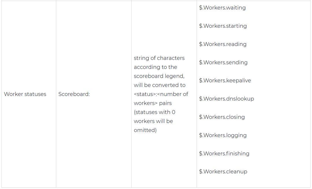 Mod_status以记分牌的形式提供了关于每个worker正在做什么,记分牌看起来是这样的: