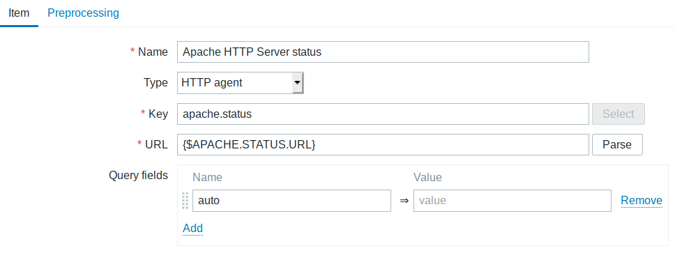 现在让我们看看如何使用Zabbix获得和解析这些数据。方便重复使用这些配置数据,最好创建Apache监控模板。使用HTTP agent监控项类型很容易获得状态数据。将其添加到模板中,将URL设置为用户宏{$APACHE.STATUS}。它的内容可以在主机上被覆盖,并添加' auto '到查询字段。数据将由依赖的监控项解析,因此历史记录可以设置为0,除非您希望保留原始数据的历史记录。