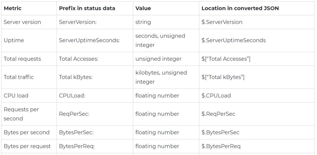 如果启用ExtendedStatus,则以机器可读的格式访问状态页:visit(例如http://<YOUR DOMAIN>/server-status?auto)→它将生成更友好的服务器状态输出,以便自动解析值