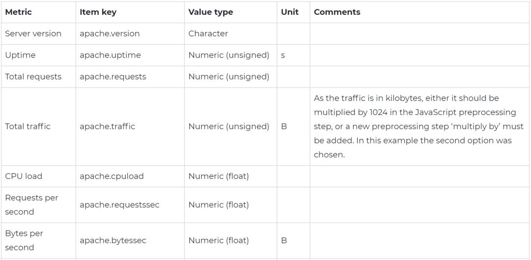 现在是有点复杂的部分——数据解析。可以使用正则表达式解析大部分数据,但是,解析workers状态(记分牌)会存在问题。这就是为什么我们将使用JavaScript预处理将Apache状态数据转换为JSON格式,依赖监控项可以轻松解析JSON格式以提取特定的参数。