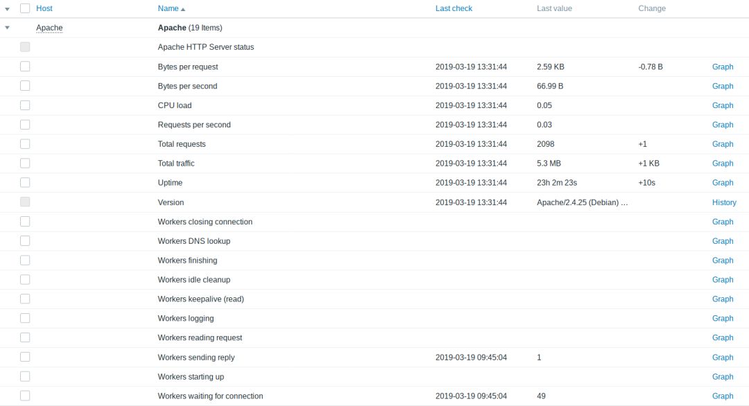 测试时先创建主机,关联模板并添加{$APACHE.STATUS},指向apache mod状态URL的主机宏。一段时间后,Zabbix应该能收集Apache状态数据: