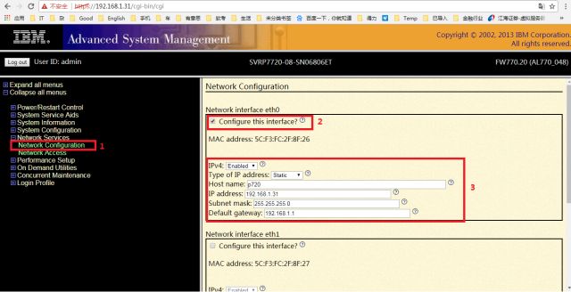 IBM的小型机配有两个HMC管理口,两个HMC管理口上默认配置的IP地址为169.254.2.147、169.254.3.147。 HMC管理口上提供了ASMI(Advanced System Management Interface)接口,通过WEB浏览器输入https://HMC口IP地址, 可以访问ASMI,默认的用户名密码为admin/admin。我们可以通过ASMI更改HMC管理口的IP地址,以匹配IBM HMC的网段,从而纳入IBM HMC管理。