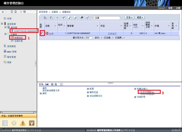 可以看到“服务器”下已经有添加的主机,点击“全部分区”下的指定主机的分区“full”,再点击“打开终端窗口”, 就可以连接到分区操作系统进行命令行操作,如下两张图: