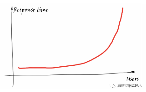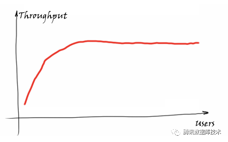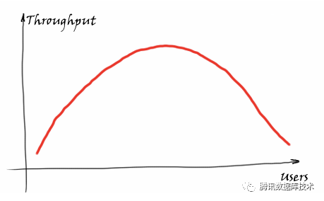 对于数据库整体吞吐而言,则是在资源未耗尽时随着连接数增加,一旦连接数超过了某个耗尽系统资源的临界点,数据库整体吞吐就会随着各连接的资源争抢而下降,如下图所示。