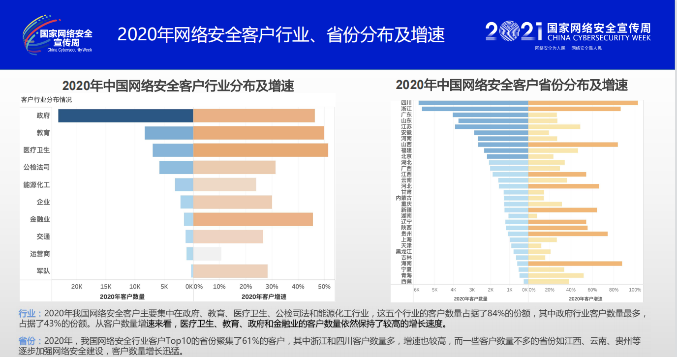 中国网络安全产业联盟秘书长,中国电子技术标准化研究院党委书记、副院长杨建军详细介绍了2021年网络安全产业发展的情况。《报告》对网络安全行业需求侧、供给侧、热点方向和资本市场进行了全面分析和展望。《报告》显示,2020年我国网络安全客户主要集中在政府、教育、医疗卫生、公检司法和能源化工行业,这五个行业的客户数量占据了84%的份额,其中政府行业客户数量最多,占据了43%的份额。