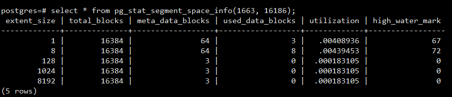 pg_stat_segment_space_info(Oid tablespace, Oid database); 参数是tablespace和database的Oid,输出位于该表空间下所有ExtentGroup的使用信息。