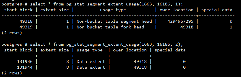 pg_stat_segment_extent_usage(Oid tablespace, Oid databse, uint32 extent_type); 每次返回一个ExtentGroup中,每个被分配出去的extent的使用情况。extent_type表示ExtentGroup的类型,合理取值为[1,5]的int值。在此范围外的会报error。