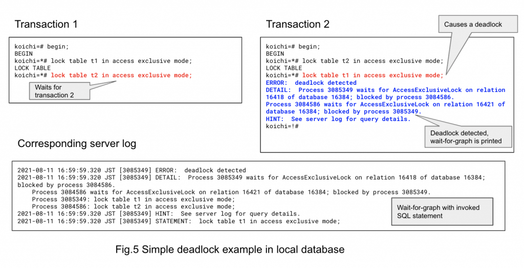 图 6 显示了一个简单的全局死锁场景。我们需要为此实现一个专用的测试应用程序,因为 psql '\c' 命令会断开当前连接。该图还显示了全局死锁导致的终端错误。这与局部死锁情况非常相似。图 7 显示了相应的 PostgreSQL 日志行。也非常相似。所有死锁消息/日志都包含额外的数据库 ID 来描述所涉及的数据库。下一步