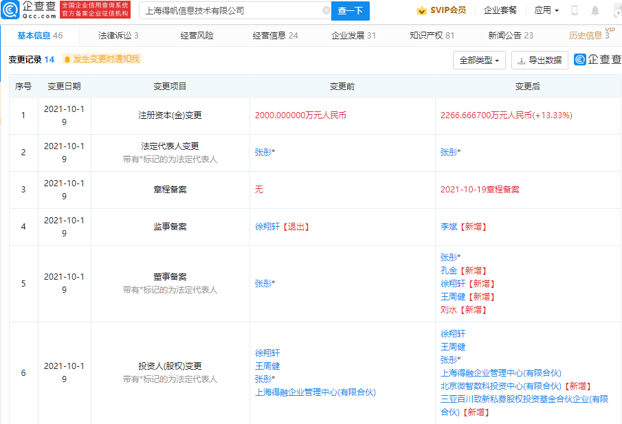 企查查APP显示,10月19日,上海得帆信息技术有限公司发生工商变更,新增百度关联公司三亚百川致新私募股权投资基金合伙企业(有限合伙)为股东,同时公司注册资本由2000万元人民币增加至2266.67万元人民币,增幅为13.33%。