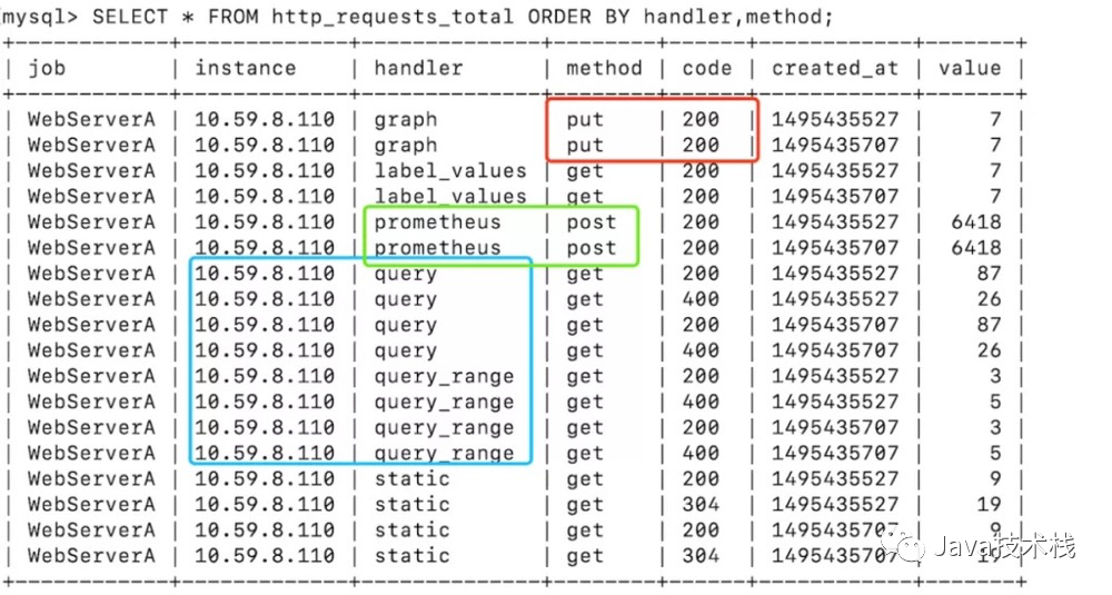 通过以上示例可以看出,在常用查询和统计方面,日常监控多用于根据监控的维度进行查询与时间进行组合查询。另外,关注公众号Java技术栈,在后台回复:面试,可以获取我整理的最新Java系列面试题和答案。