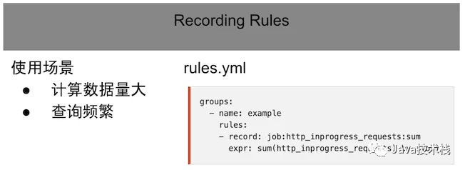 因此,Prometheus提供了 Recoding rules,可以预先计算经常需要或者计算量大的表达式,并将其结果保存为一组新的时间序列, 达到一次计算,多次查询的目的。