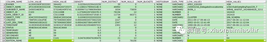 数据字典中的字段LOW_VALUE和HIGH_VALUE分别存储的就是目标列的最小值和最大值,CBO用LOW_VALUE和HIGH_VALUE来评估对目标列做范围查询时的可选择率。不过这两个字段的返回值是RAW类型的,需要转换后才能识别。可以使用UTL_RAW.CAST_TO_NUMBER、UTL_RAW.CAST_TO_VARCHAR2等函数来转换,也可以使用存储过程DBMS_STATS.CONVERT_RAW_VALUE来转换,下面给出示例: