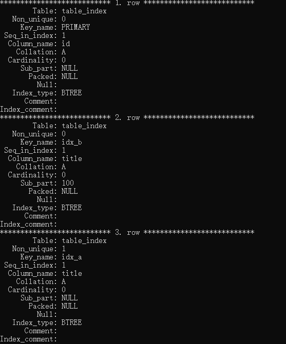 | Index_type | 索引的类型,对于InnoDB只支持B+树索引,所以都是显示BTREE |