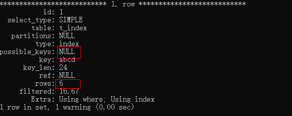 EXPLAIN SELECT * FROM t_index USE INDEX(a) WHERE a = 'a' AND b = 'b' AND c = 'c' \G;
