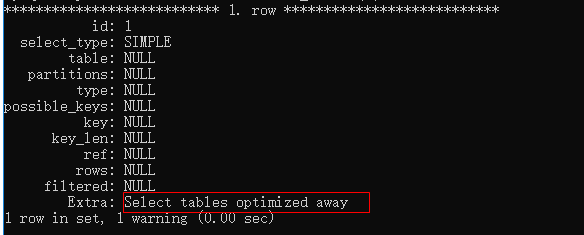 如果是myisam引擎,Extra列会输出Select tables optimized away