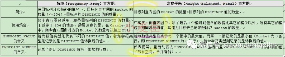 Oracle数据库里的直方图使用了一种称为Bucket(桶)的方式来描述目标列的数据分布。Bucket(桶)是一个逻辑上的概念,相当于分组,每个Bucket就是一组,每个Bucket里会存储一个或多个目标列中的数据。Oracle会用两个维度来描述一个Bucket,这两个维度分别是ENDPOINT_NUMBER和ENDPOINT_VALUE,Oracle会将每个Bucket的这两个维度记录在数据字典基表SYS.HISTGRM$中。列的直方图的类型可以通过查询视图DBA_TAB_COL_STATISTICS的HISTOGRAM列来获取,一般情况下包含3类,NONE(没有直方图)、FREQUENCY(频率直方图,也叫等频直方图)、HEIGHT BALANCED(高度平衡直方图,也叫等高直方图)。在Oracle 12c中,又新增了两种类型的直方图,分别是顶级频率直方图(Top Frequency Histogram)和混合直方图(Hybrid Histogram),本书只讨论频率和高度平衡直方图。