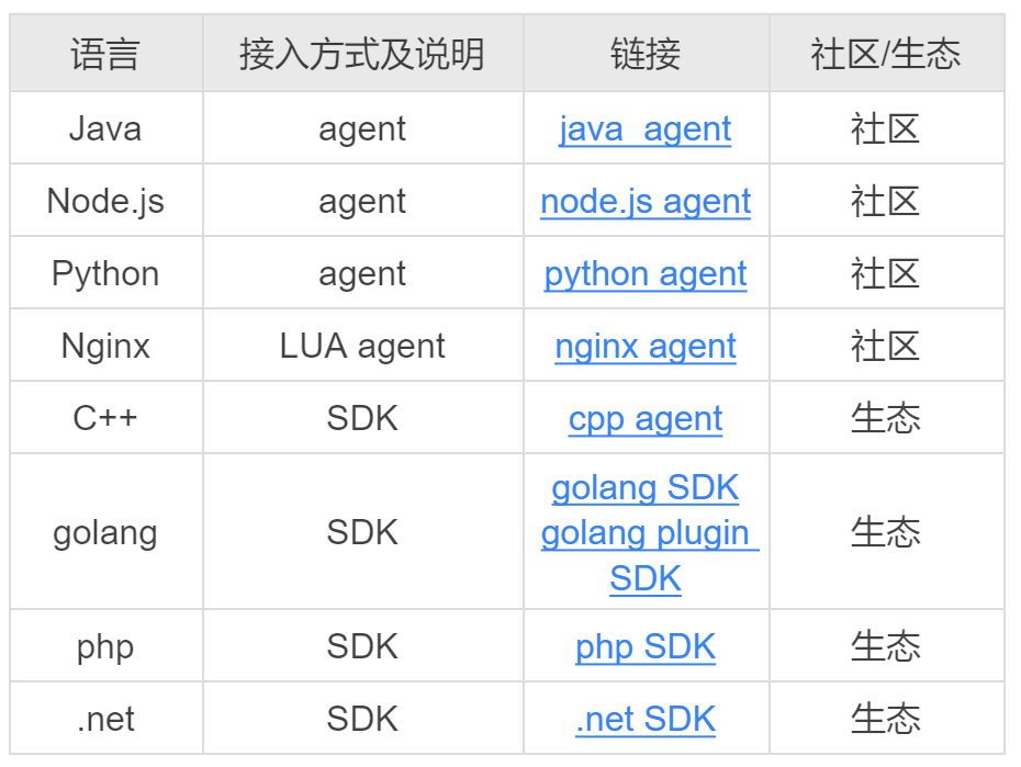 Skywalking 针对不同语言提供了不同的支持方案。一种是基于“agent”的接入,一种是基于SDK的接入。