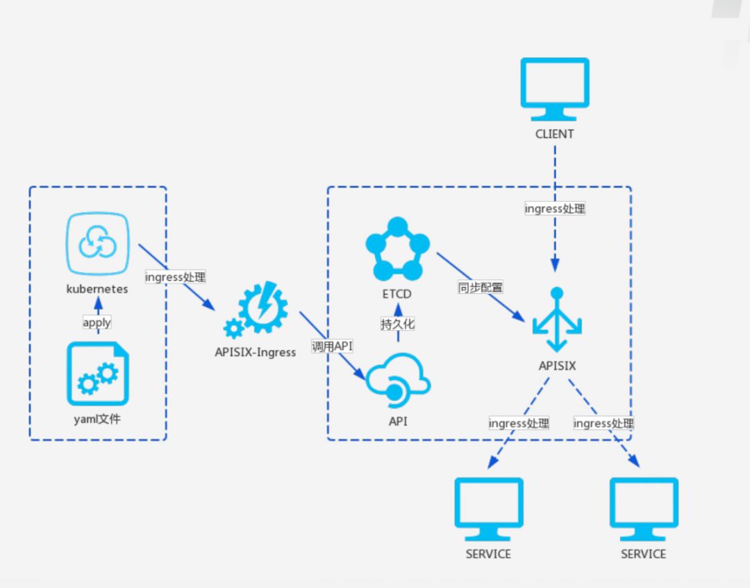 第一部分:需要将 Kubernetes 集群中的配置、或 Kubernetes 集群中的状态同步到 APISIX 集群。 第二部分:需要将 APISIX中 的一些概念,比如像服务、upstream 等概念定义为 Kubernetes 中的 CRD。