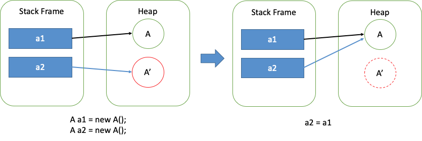 和前面例子几乎一致,只是最后我们把a1赋值给a2。这里a2的值就变了,也就是说a2指向的对象变成了a1指向的对象,a2原来的对象就没有别的东西引用它了,程序在此之后没有任何办法可以访问到它。所以它就变成了真正的垃圾。请看下图: