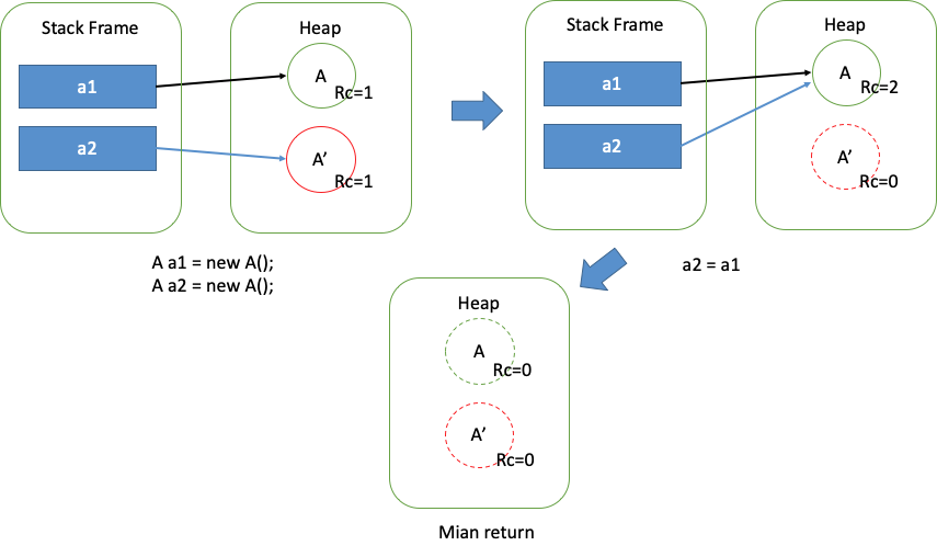 A a2 = new A(); // 在堆上创建对象A1,A1.rc++;