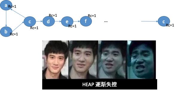 单单一个环,带了一个长长的小尾巴,导致整个链上的所有对象无法回收,Heap内存逐渐失控,最终出现OOM异常,系统崩,代码卒。那么如何处理这个循环引用的问题呢?
