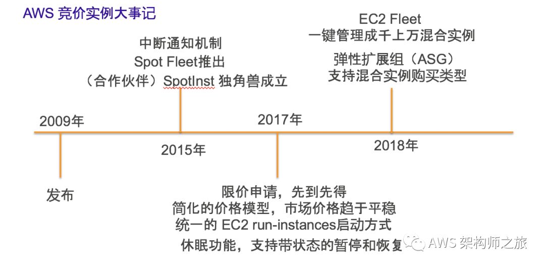 成熟的竞价实例市场:竞价实例市场相对的是 EC2 现货市场,是一种购买方式的创新,2009年 12月 份 AWS 开始推出竞价实例购买方式,初衷是随着AWS规模的不断壮大和硬件更新升级换代,云中很多算力未能充分利用,如何将这部分闲置算力提供给客户,为了区分 EC2 现货市场,推出了竞价市场,客户可以以非常低的价格竞价抢占使用;直到 2017年 底,AWS 宣布推出全新的、更加简化实用的定价模型,并且将竞价实例的启动方式和普通现货的 EC2 实例统一一致,这两项举措大大促进了竞价实例的繁荣和广泛应用。我想不需要任何额外的商务条款即可最低以现货按需实例价格的 10% 的低折扣使用云计算算力资源,任何客户都无法拒绝!