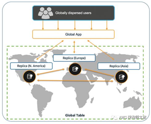 AWS DynamoDB 在移动、Web、游戏、电商、广告和物联网等需要任意规模且低延迟数据访问的场景中有广泛应用的键值及文档数据库,每天可处理超过10 万亿个请求,并可支持每秒超 2000万的峰值。和关系数据库类似,都是以“表”为核心的操作单位,不过底层是分布式架构,存储和性能都支持自动扩展,使用起来非常省心;而 Global Tables 在 2017年发布的新功能,是为了满足客户多区域容灾和全球扩展的需求,其基本用户体验如下: