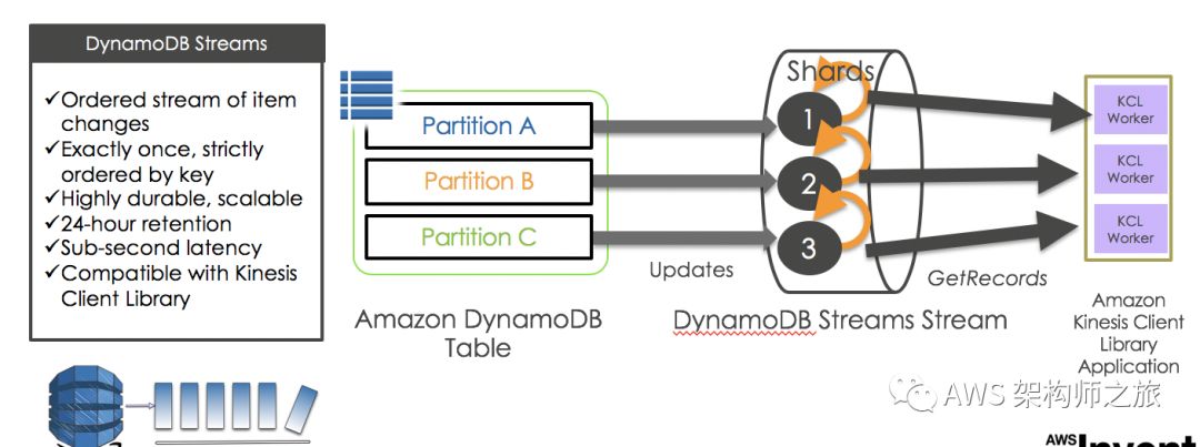 对于 DynamoDB 服务而言,暴露给用户的并不是日志,而是重用了Amazon Kinesis Stream 的事件流。DynamoDB 的数据变更事件流提供客户一个灵活捕获数据表变更的编程方式,而流本身具备高可用、持久化、有序和去重等符合数据准确复制的原则;对于 DynamoDB 流而言,每个底层的存储分区对应流的一个分片,分片数量随着存储分区的变化而动态变化(Kinesis Client Library- KCL库可以自动处理父子分片,以保障数据的有序处理),对于 DynamoDB 表中修改的每个项目,流记录将按照对该项目进行的实际修改的顺序显示,而且保障每个流记录仅在流中显示一次,可以利用 Kinesis 的流处理 KCL 库进行自动的检查点设置和批量处理。