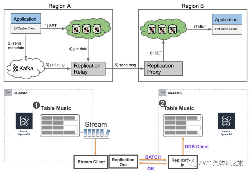回顾 Netflix EVCache 的跨区域复制的架构,我们发现很多类似的地方,及细微的差异(1)Netflix 利用定制的 EVCache客户端,在数据SET等操作的同时写入了一条变更消息到 Kafka 队列;而 DynamoDB 天然支持数据变更消息的流式存储,用户无感知(2)Netflix 和 DynamoDB 在目标区域都利用 NoSQL 的基本原语进行数据变更回放(3)Netflix 的 Kafka 队列中仅仅保存消息,没有数据本身,需要的时候直接读取 EVCache 内存数据,而 DynamoDB 流中可以直接读取变更消息和变更前后的数据(4)两者最核心的都是如何实现一个高效、高可用、低成本的跨区域“复制”组件。