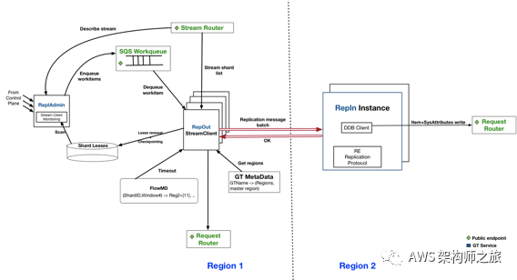 虽然我们日常使用不需要太关注 Global Tables 的实现细节,但透过 AWS reinvent 的相关资料,我们可以更好的理解该功能模块的基本原理客观理解该功能对我们全球业务扩展的架构影响,下图是资源链接中 AWS 专家在介绍整个 DynamoDB 底层原理时披露出来的 Global Tables 核心架构,可以看出来设计一个可靠、可用、可维护并可以对客户开放的跨区域“复制”系统并不是一件容易的事情: