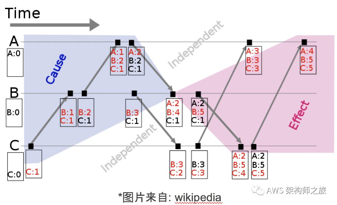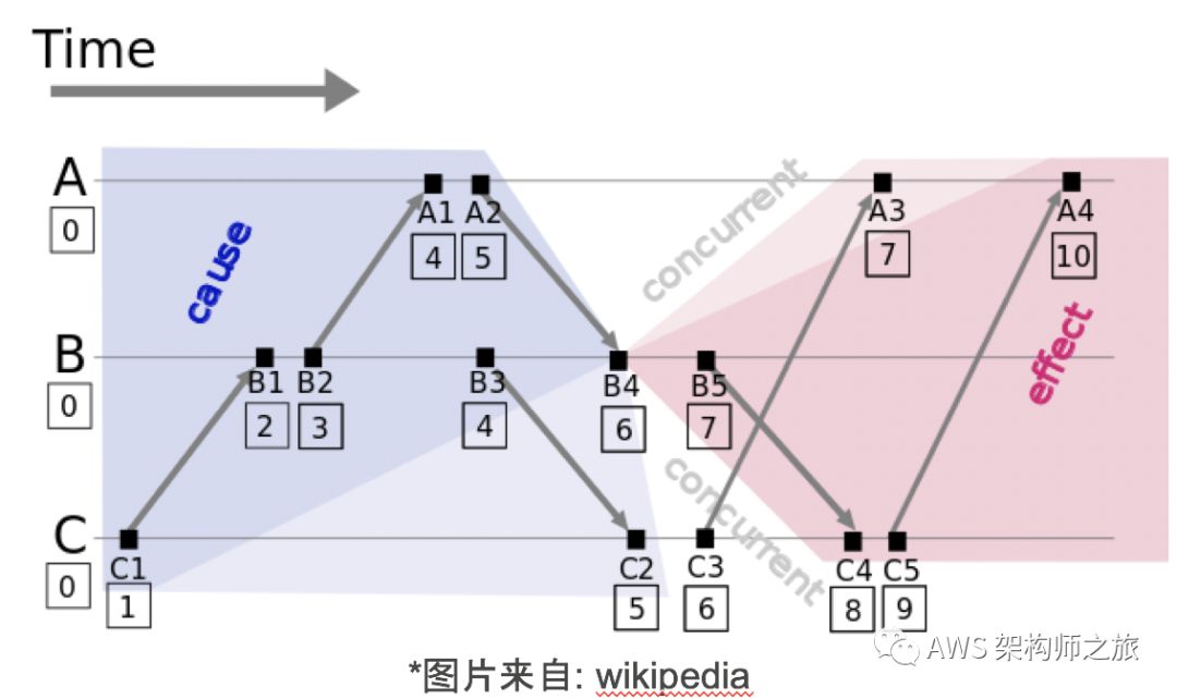 逻辑时钟的算法基本逻辑如下:(1)每个节点本地维护一个逻辑时钟LCi,通常初始化为0 (2)每个本地事件发送,LCi = LCi+1,该时间戳就是事件发送的逻辑时钟(3)当节点i发送消息M给节点j的时候,把逻辑时钟放到消息里(4)当节点j收到消息M时,LCj = max( LCj , Mtimestamp ) + 1。如上图所示,假定三个进程,C发送消息给到 B,B 收到 B1消息时,在 0和 1(C1 带的时间戳)取大值再加1,因此 B1的时间戳是2;B2紧随 B1在同一个进程B中发送,因此时间戳加1,B2的时间戳变成 3;按照算法类似推导出其他消息的逻辑时钟值。该算法可以通过A->B表达,A的逻辑时钟比B事件的逻辑时钟要小,反过来,只比较两个事件的逻辑时钟无法判断事件A和B的先后,比如上图中的 C3和 B4,逻辑时钟值一样大,这种并发的场景,单纯的逻辑时钟算法无法处理。这种并发关系的表达可以用版本向量(VersionVector) 也被称为Vector Clock来解决;