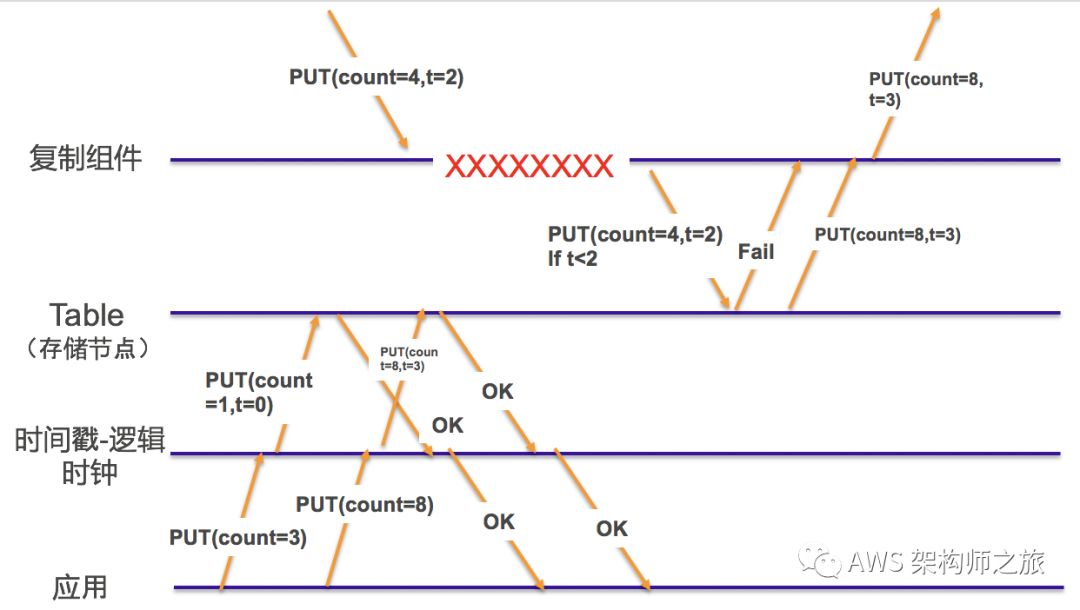 数据条目的时间戳是否可以从 DynamoDB Stream 流中的流数据条目中的事件发生时间赋值呢?还是数据更新请求到达 DynamoDB 的第一层 “RequestRouter” 后即被赋予一个时间戳?或者修改 DynamoDB 的客户端代码,在 PutItem 操作时,应用层赋值该时间戳?AWS 底层实现对于我们而言是一个黑箱,我们这里就不过多猜测,假定我们解决了每个数据条目都有时间戳的问题,那接下来我们就可以直接比较两个时间戳的前后顺序的吗?