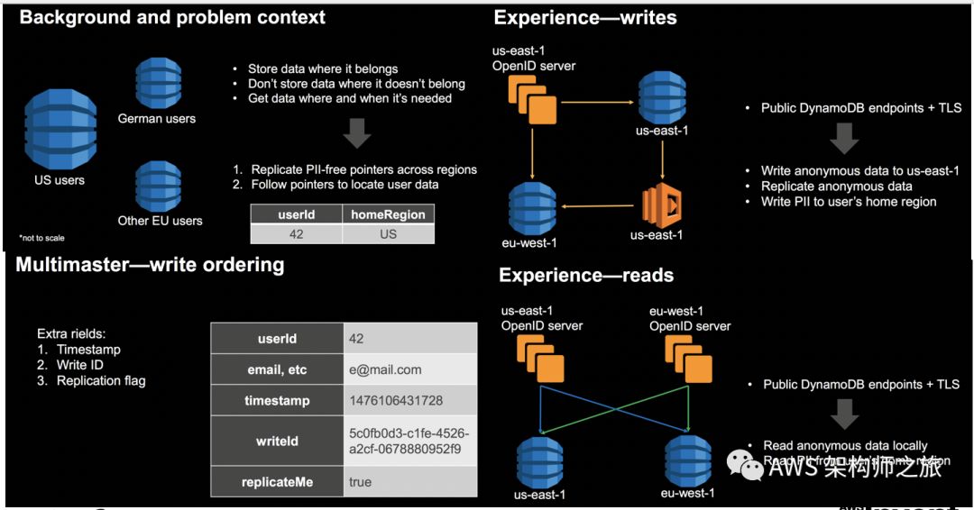 其实早在 GlobalTables 原生功能出来之前,很多客户基于 DynamoDB Stream 和 Lambda 根据自己的业务需求实现过跨区域的表数据同步,比如2016年的 re:invent 大会上,Under Armour 为了满足 1880万全球会员的移动用户体验,将数据分为匿名数据和 PII(Personallyidentifiable information) 数据两类,PII 数据只能落在会员的 Home Region,而匿名数据可以全球多区域复制,而数据存储就在Amazon DynamoDB,整个架构基于 Labmda,CloudWatch,DynamoDB Stream等原生服务,在他们介绍经验的时候已经稳定运行1年之久,没有发生任何异常警报,美东和欧洲爱尔兰区域之间延迟在 50ms 左右,和日本区域之间 150ms 左右;在 2016年的公开演讲中,他们正在计划实施多区域多写以满足多区域的容灾需求。