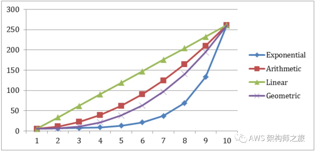 重试退避功能用于计算延迟的算法,在退避阶段,从第一次到最后一次重试的延迟时间计算方法(1)线性的(2)算术的(3)几何的(4)指数的:
