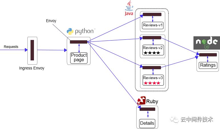 这个是一个图书信息系统,分成productpage, reviews, details和ratings四大模块,可能会有如下的调用关系