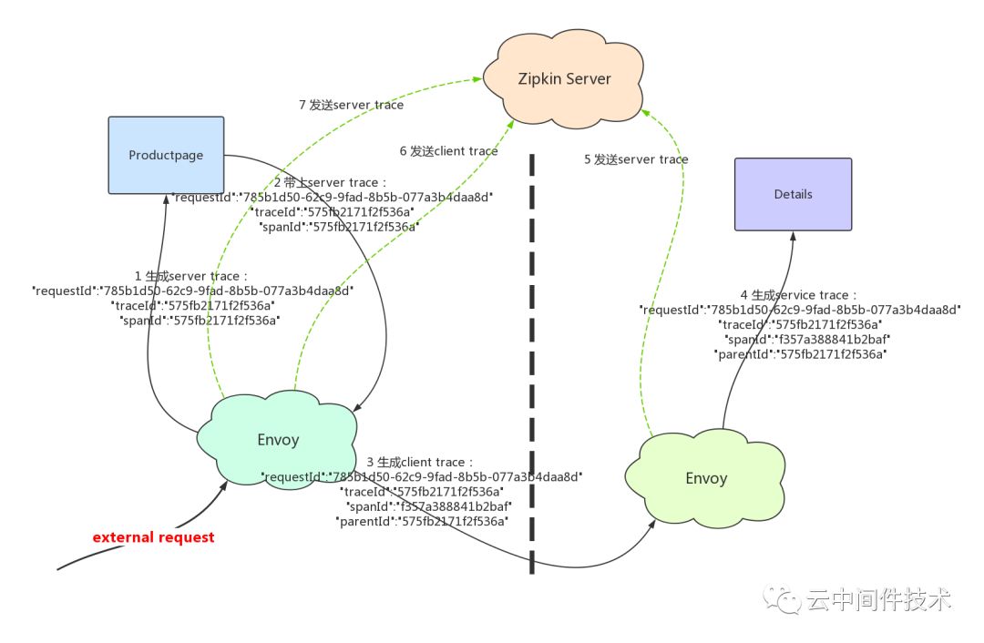 2) productpage服务的envoy收到请求后,会生成x-request-id,x-b3-traceid和x-b3-spanid头,并填充到请求中,转发给本地的productpage服务。