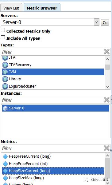 4. 然后切换到Metric Browser界面,选中Server-0,Type:JVM,Instances: Server-0 ,Metrices: HeapSizeCurrent