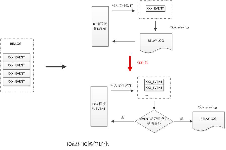 全部event组成一个完整的事务,完整的事务才会被SQL线程正确复现到从库上。当前IO线程接收binlog时,是以event为单位进行接收,即接收到一个event,记录到relaylog中后再继续接收下一个。这种做法是低效的,也没有充分利用到MySQL本身的文件缓存。