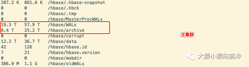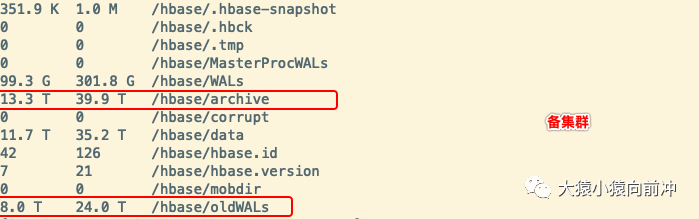 我们遇到的异常是,主备集群HBase的相关目录数据量极不正常,如下图所示:主集群