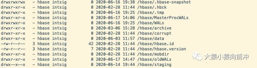 在继续往下探讨之前,还是乖乖复习一下HBase各个目录的说明和作用,此处以我们当前使用的版本为例。hdfs dfs -ls hbase