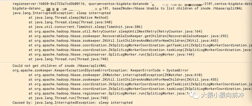 WALs目录下多了很多-splitting后缀的文件夹,且其文件名中的时间戳全是2020-05-22那天(惊魂重启的日子)再下一级目录中的文件呢,文件名中的时间戳也是那天,过期了这么久的数据没有被及时清除,一时间也想不明白这是为啥。数据没被删除,一定是哪里有引用。HBase依靠zookeeper来保持状态(姑且这样理解),所以理所当然,我们首先需要排查下zookeeper中HBase的目录,因为可能一些过期的ZK的状态清除时出现异常,没有及时清理,存在引用,导致HBase的一些文件也没有及时被清理,所以空间占用居高不下。[meta-region-server, replication, rs, backup-masters, splitWAL, table-lock, flush-table-proc, master-maintenance, online-snapshot, switch, master, running, balancer, draining, namespace, hbaseid, table]Zookeeper上这么多的目录,还真不知道该怎么看,那怎么办!只能一个一个ls看一下,再加上望文生义,大胆猜测。划重点了,zk中splitWAL这个path看着貌似跟WALs这个目录有关系呀!ls 一下,是空的!别的地方也没有找到类似相关的信息。说到这里,需要插入一个之前我们重启集群时遇到的异常。