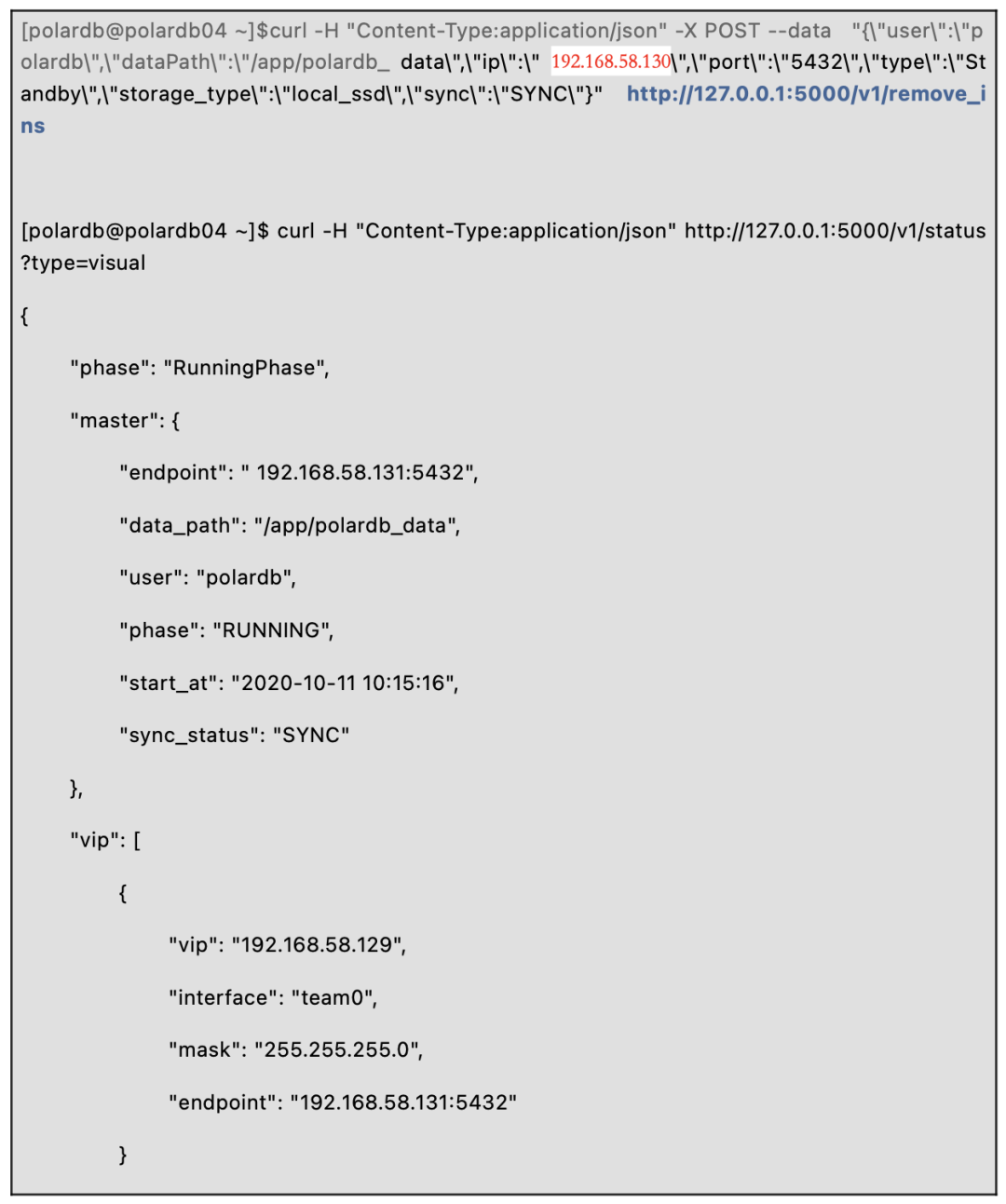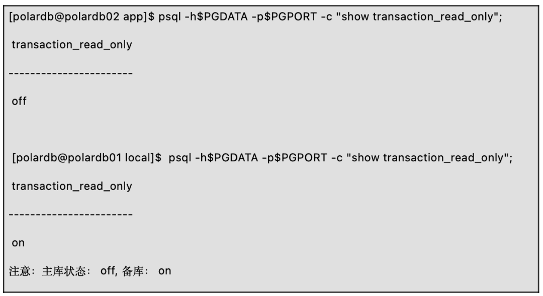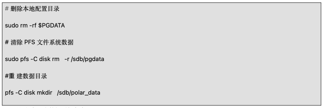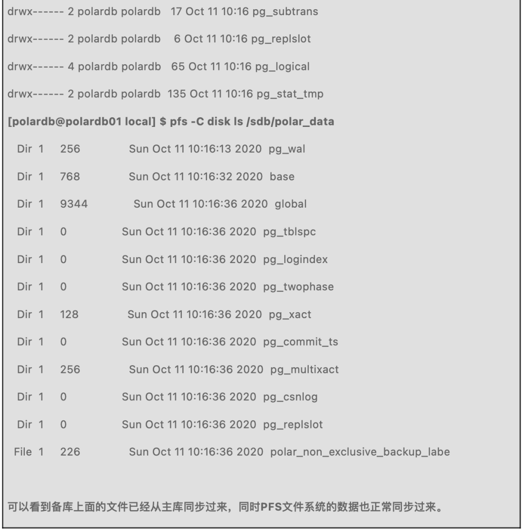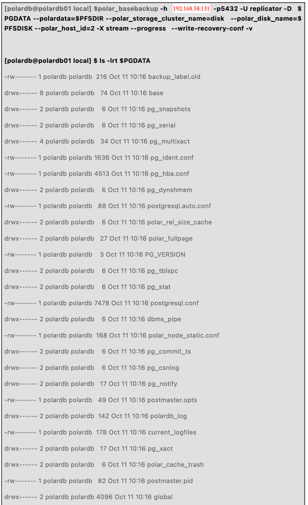 旧主库节点修复好后,利旧用于新备库。为了快速与主库建立集群关系,新备库不做太多变量操作只要将PFS文件系统中的数据清理掉,并保留polardb安装软件,就可以了。使用polar_basebackup物理备份工具远程从主库拉文件到备库,最后在CM上面将备库加入节点建立集群复制关系。下面详细介绍一下备库的恢复过程。
