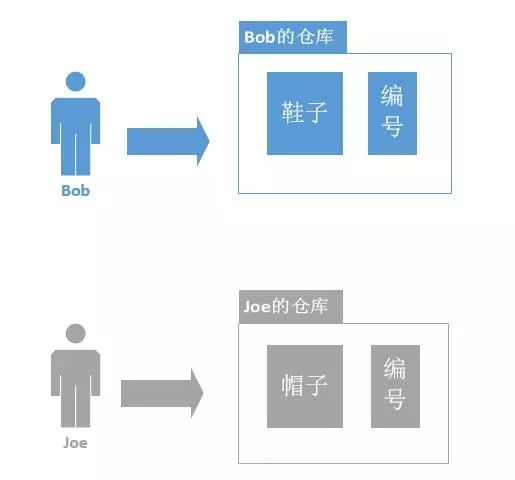 在M公司有两个仓库管理员Bob和Joe,Bob的仓库里面放的是鞋子,通过编号进行区分;Joe的仓库里面放的是帽子,也是通过编号进行区分。将场景中的物体与数据库相映射,Bob和Joe是用户,两个人的仓库是schema,鞋子和帽子属于schema里面的object。